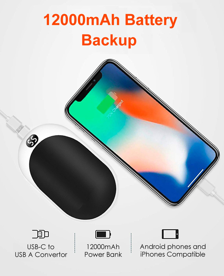 | * అంతర్నిర్మిత 12000mAh లిథియం బ్యాటరీతో హ్యాండ్ వార్మర్ & పవర్ బ్యాంక్ ఫోన్ ఛార్జర్ | |