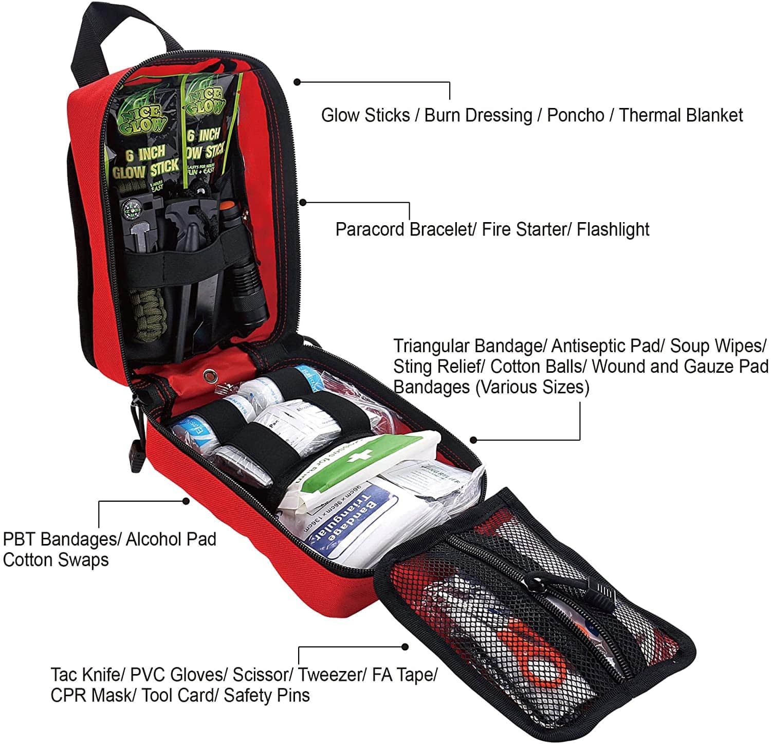 అత్యంత ప్రజాదరణ పొందిన మనుగడ అవసరాలను కలిగి ఉంటుంది: 3-మోడ్ టాక్టికల్ ఫ్లాష్లైట్, మల్టీ-ఫంక్షన్ పారాకార్డ్ బ్రాస్లెట్ (దిక్సూచి, విజిల్), చెకుముకిరాయి, కత్తి, సాబెర్ కార్డ్, రెండు గ్లో స్టిక్లు మరియు రెయిన్ పోంచో |